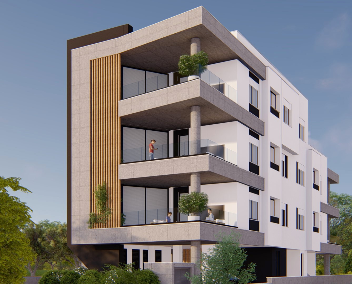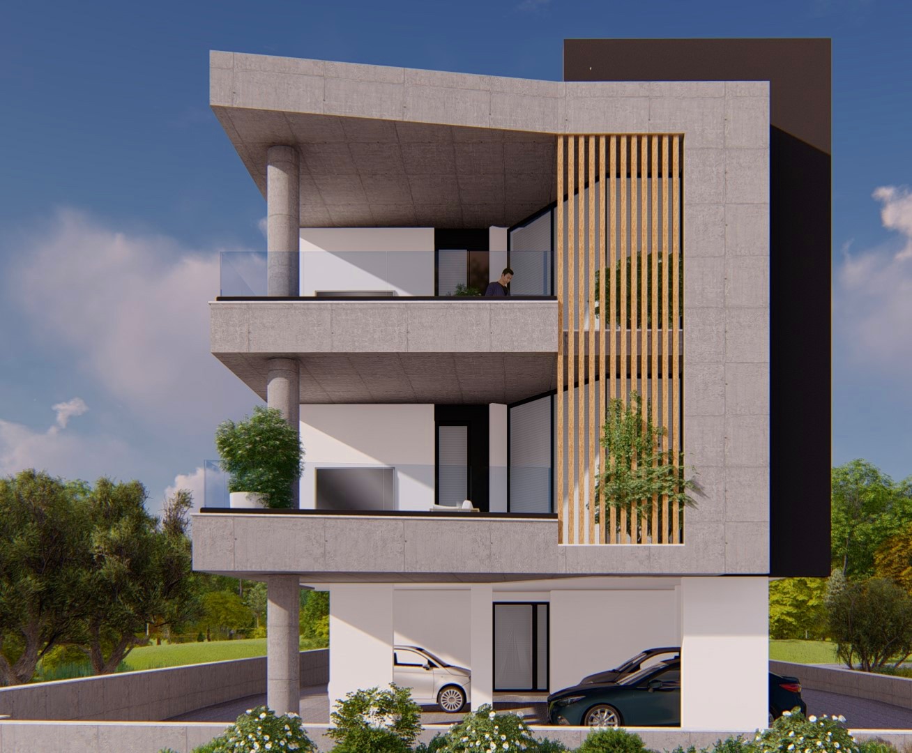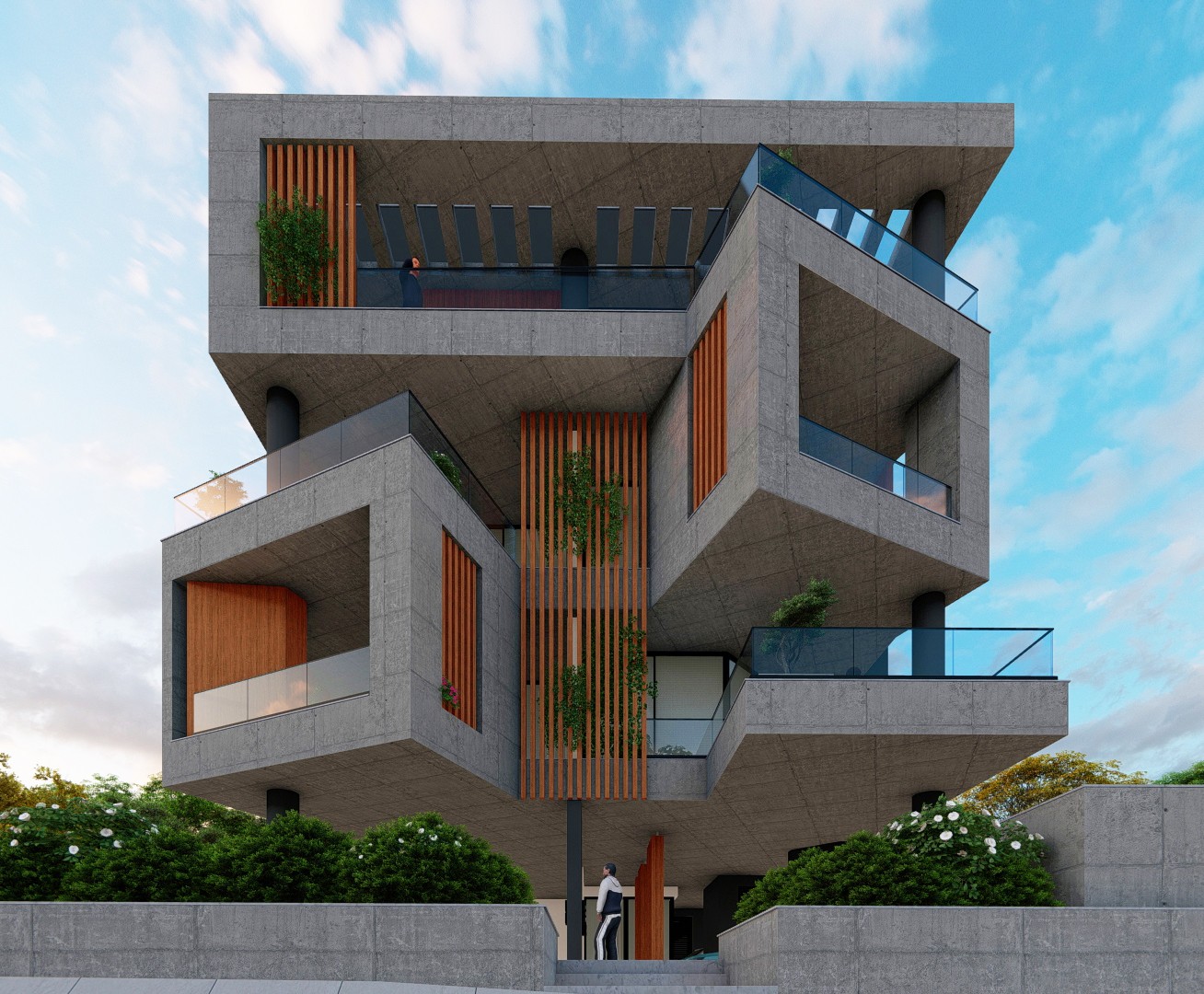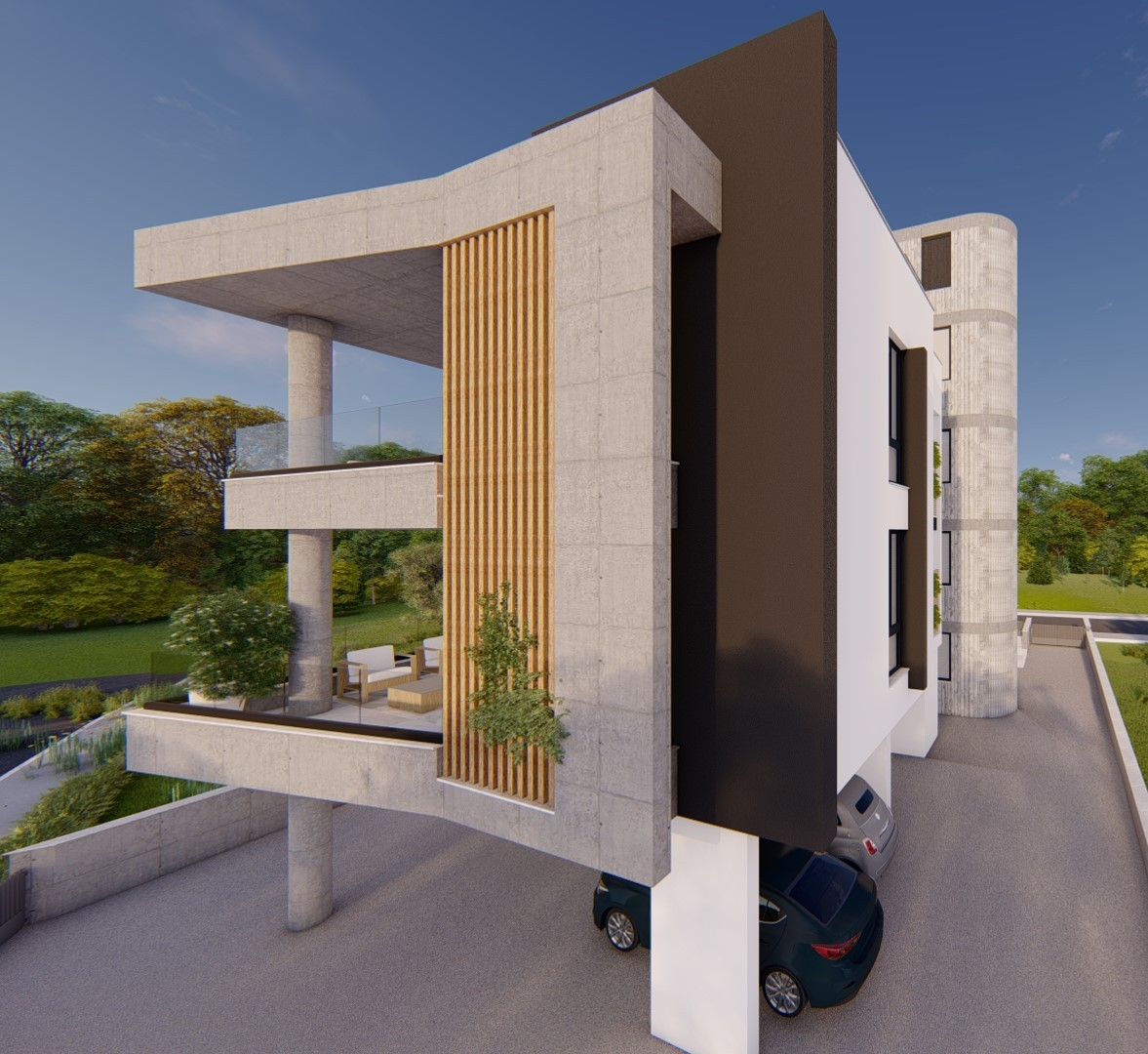 The architectural treatment differs in tone between the two. The south building adopts a more sculptural, brutalist expression with interlocking concrete volumes and deep-set balcony cavities. The north building is cleaner and lighter, pairing exposed concrete slabs with rendered white walls and cylindrical concrete stair-and-lift towers. Both elevations are unified by cantilevered balcony slabs and vertical timber louvers.