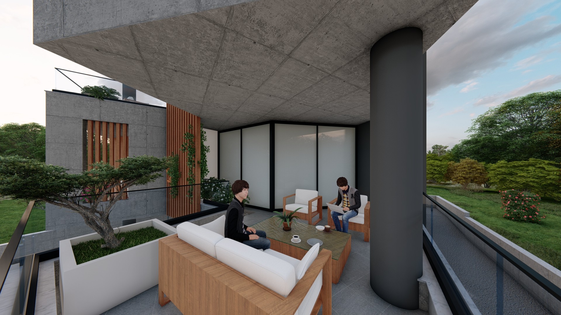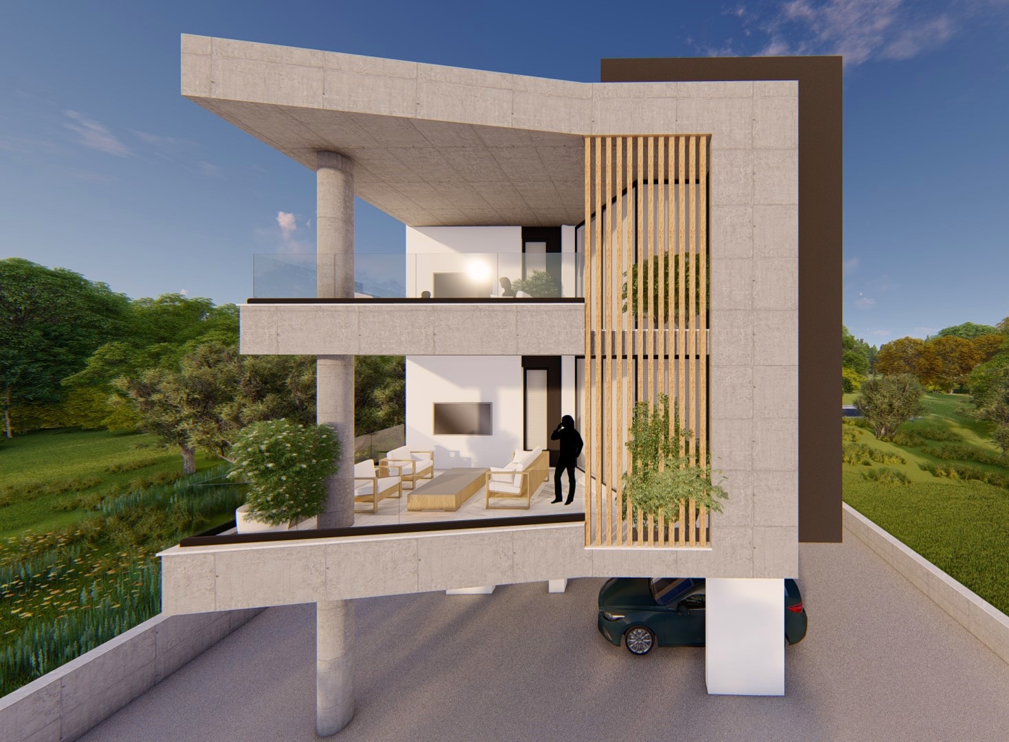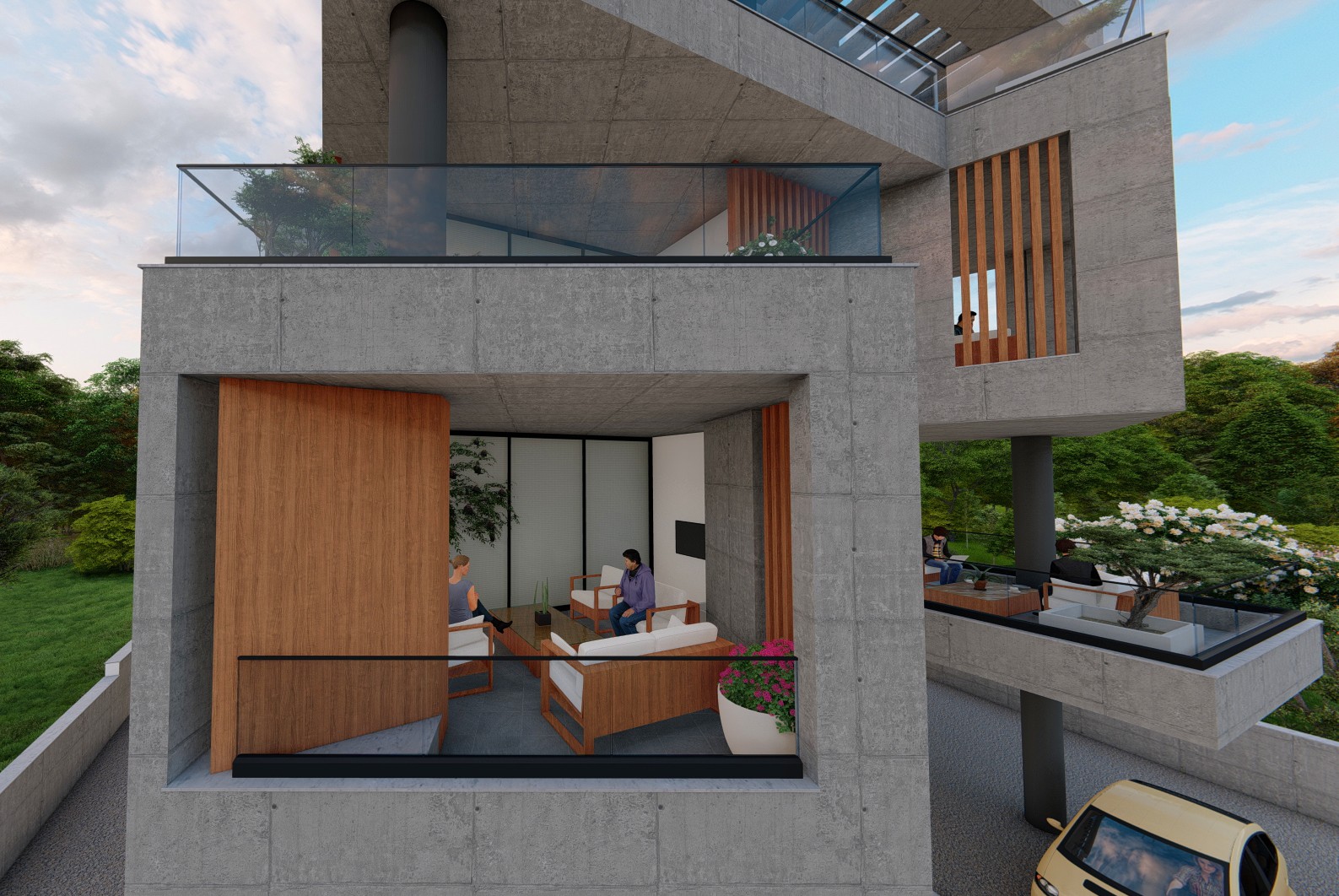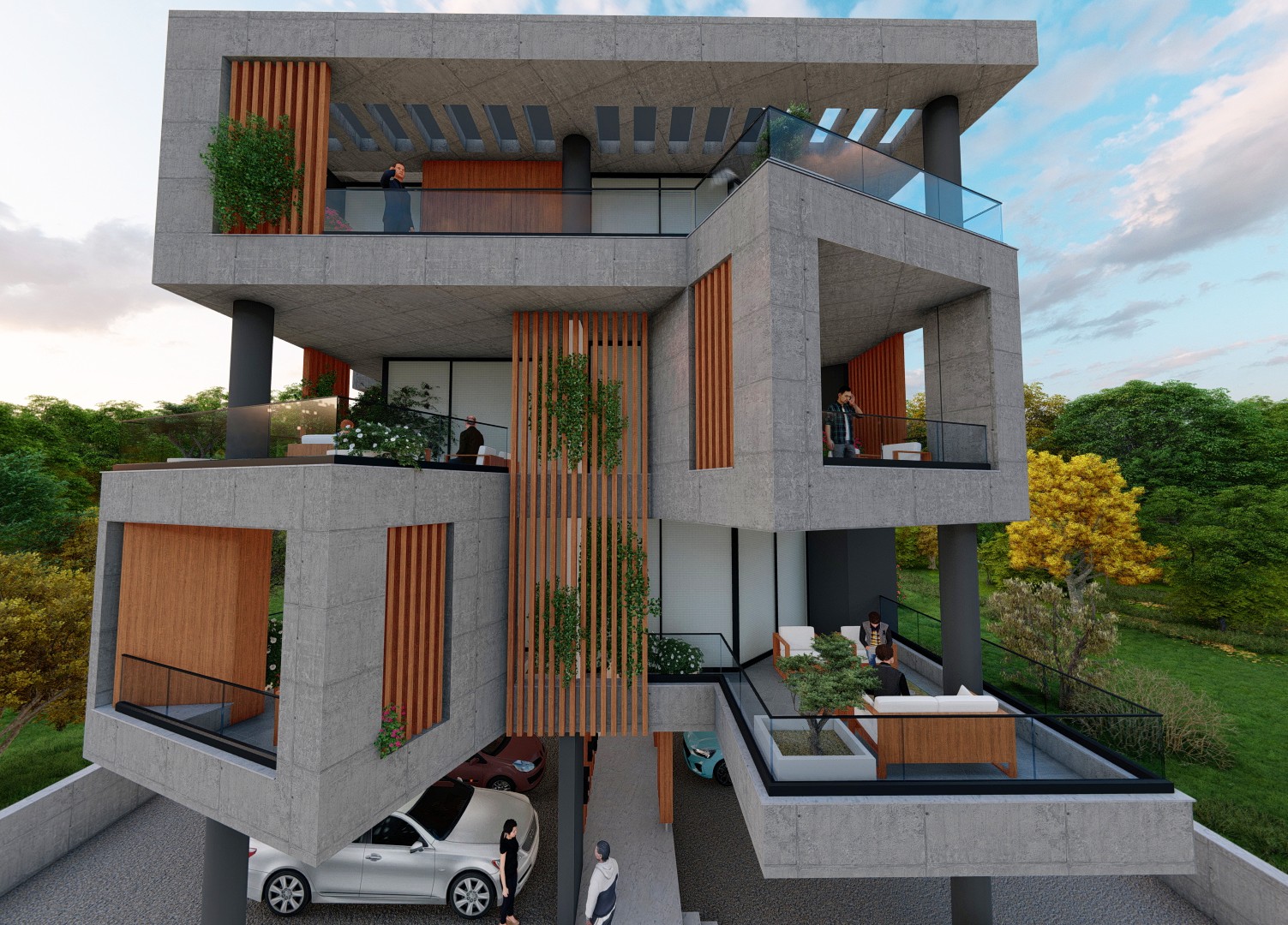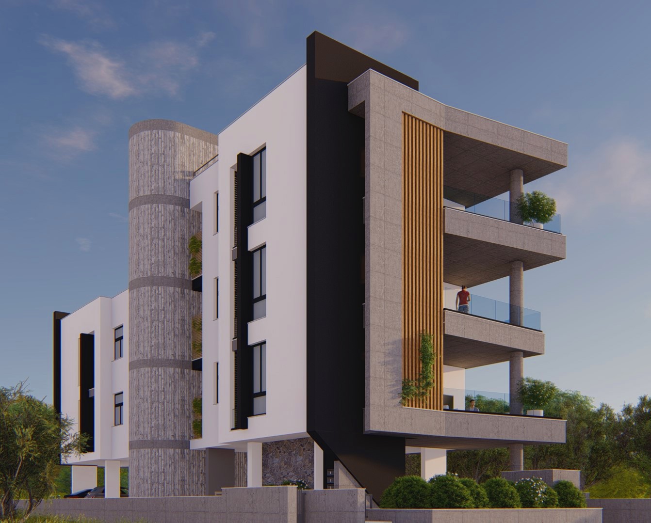 The architectural treatment differs in tone between the two. The south building adopts a more sculptural, brutalist expression with interlocking concrete volumes and deep-set balcony cavities. The north building is cleaner and lighter, pairing exposed concrete slabs with rendered white walls and cylindrical concrete stair-and-lift towers. Both elevations are unified by cantilevered balcony slabs and vertical timber louvers.
