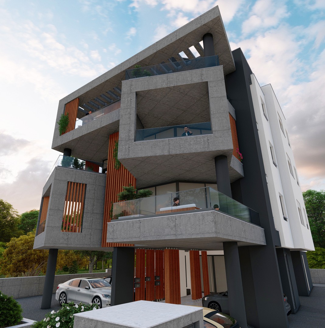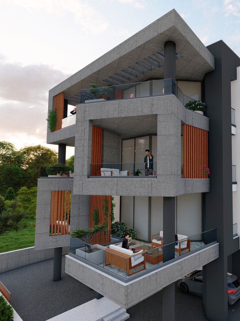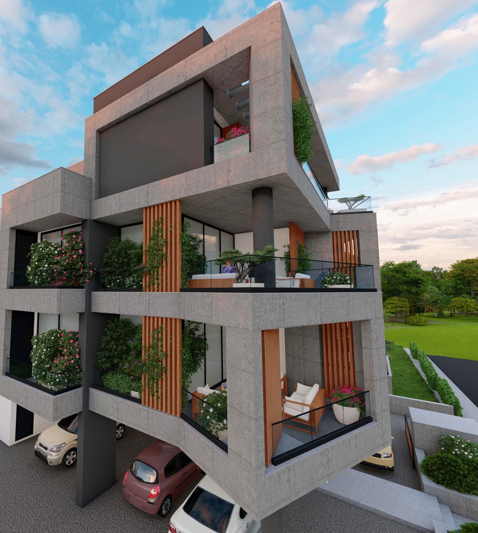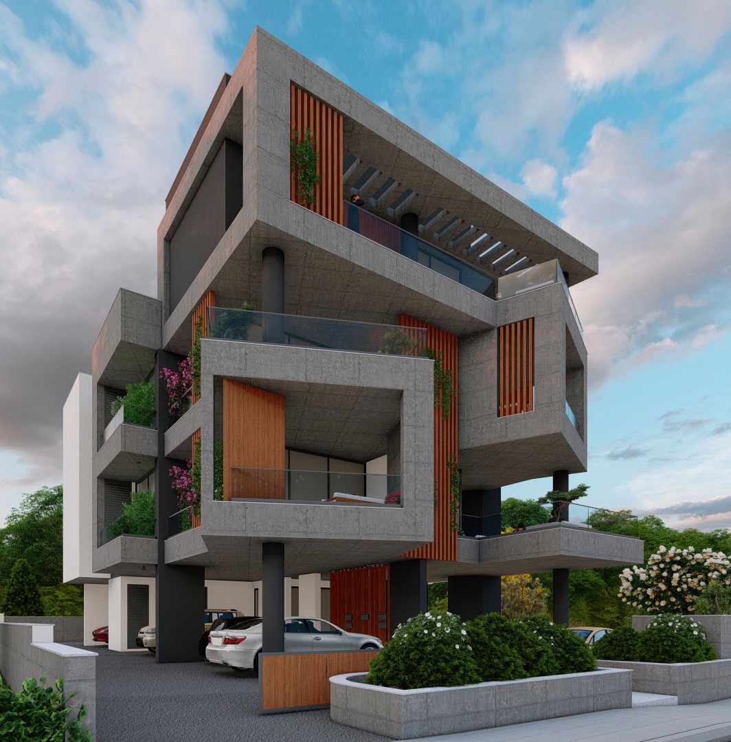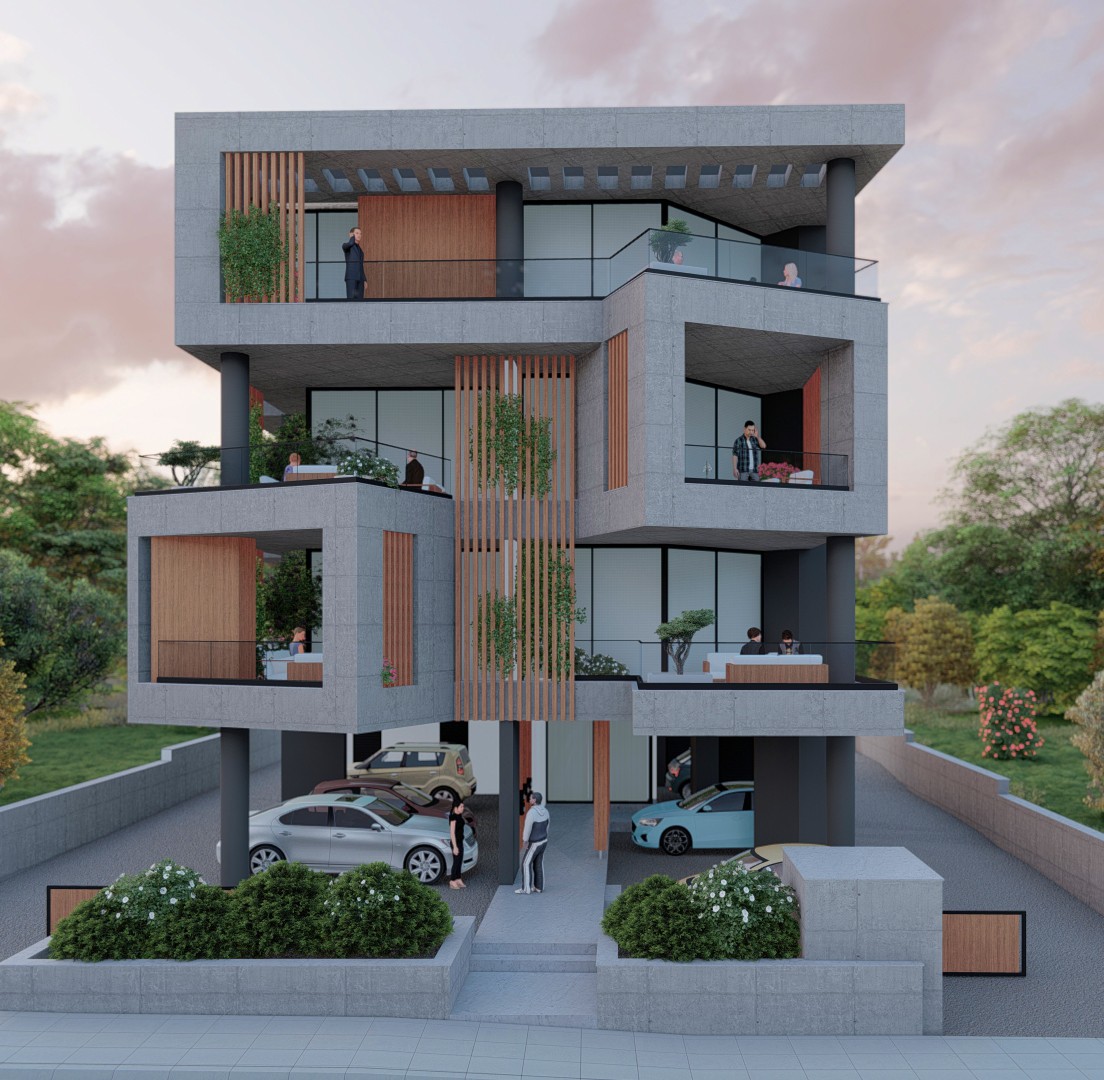 Agia Fyla Residential Complex is a pair of four-storey residential buildings in the Agia Fyla quarter of Limassol, set on adjacent plots and unified by a shared architectural language of exposed concrete, cantilevered slabs, and vertical timber louvers. Each building sits above an open pilotis level that provides covered parking and access to the entrance lobby, with four residential storeys above.