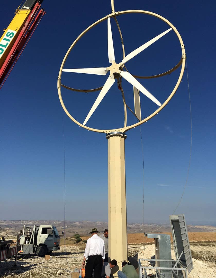 Athienou Wind Farm is a completed renewable-energy installation in the Athienou area of Cyprus, built around a proprietary diffuser-augmented wind turbine design rather than conventional off-the-shelf turbines. Each unit pairs a five-blade rotor with a circumferential diffuser ring, mounted on a tapered steel pole set on a reinforced-concrete footing foundation.
