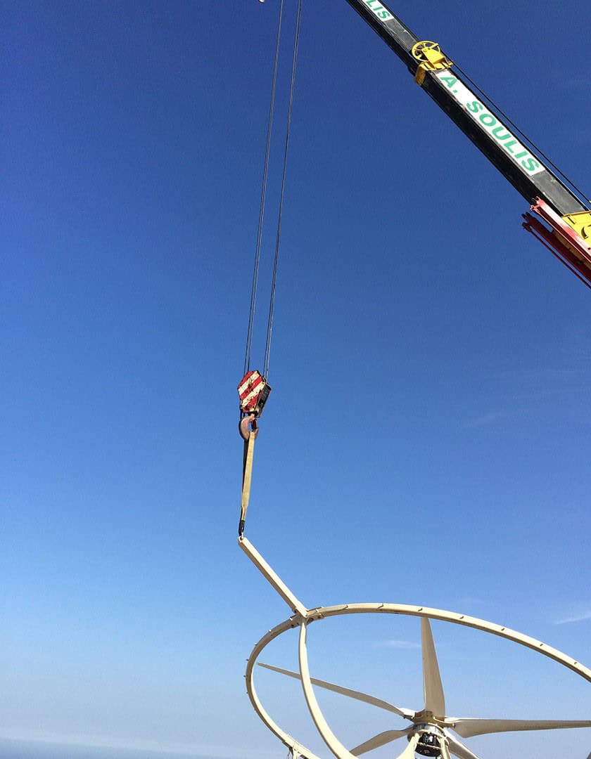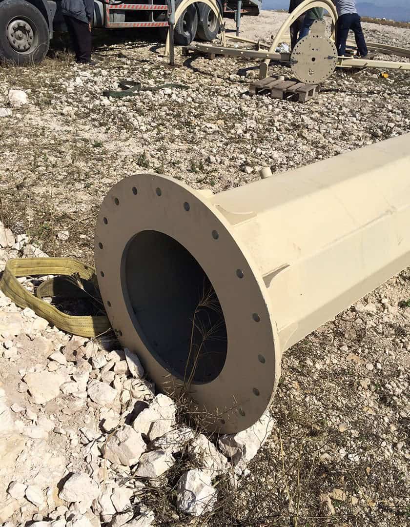 The diffuser shroud combines a steel structural frame with carbon-composite panels, and the detailing at the steel-to-composite connections was worked out alongside the primary structural design. The foundation design addressed cyclic wind-fatigue demands and the seismic conditions of the Cyprus region, with the base flange connection to the concrete footing sized for the overturning moments generated by both rotor thrust and diffuser drag.