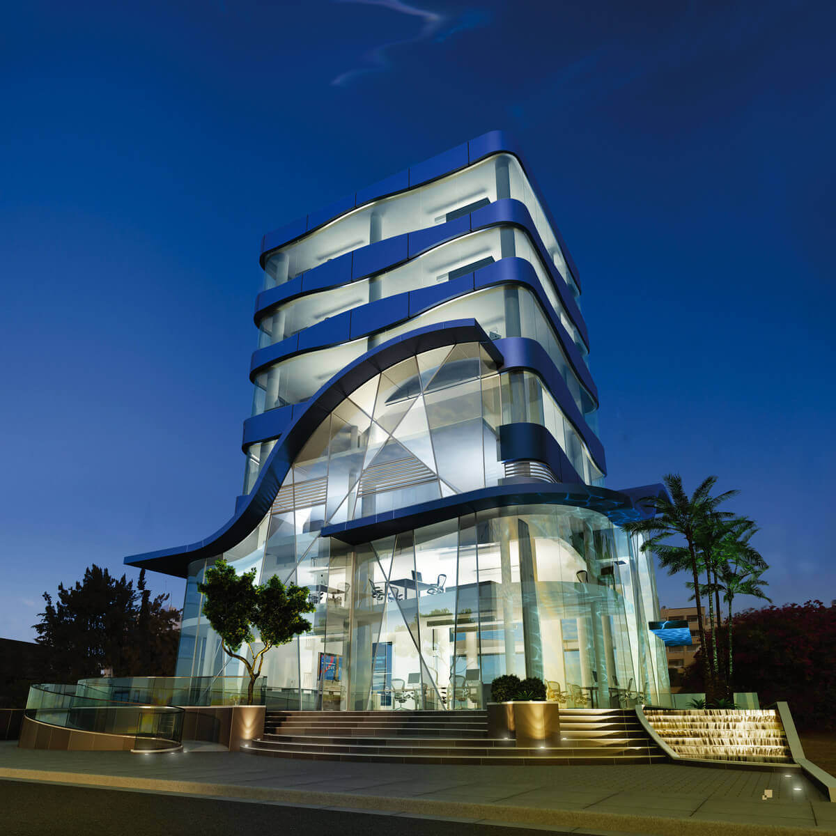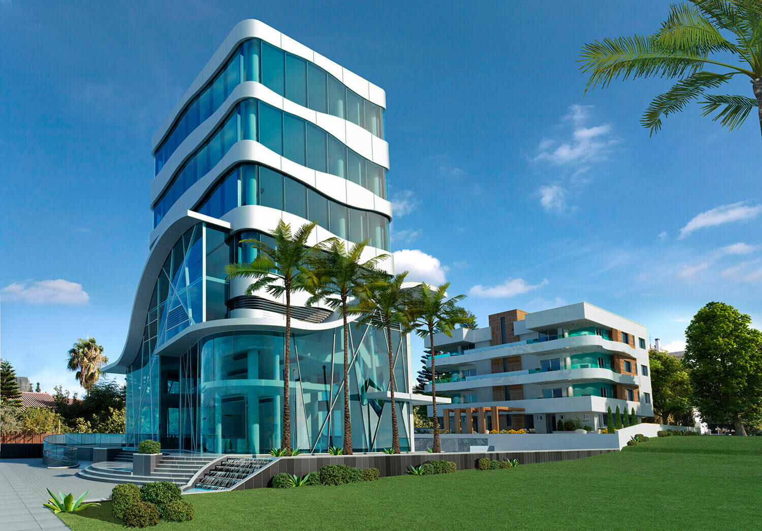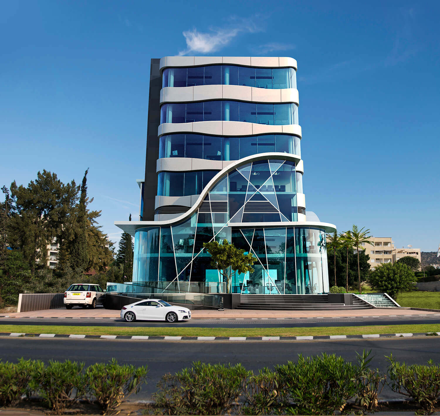 An ultra-modern commercial tower with panoramic sea views, showcasing its beauty on Limassol’s main tourist beachfront avenue.